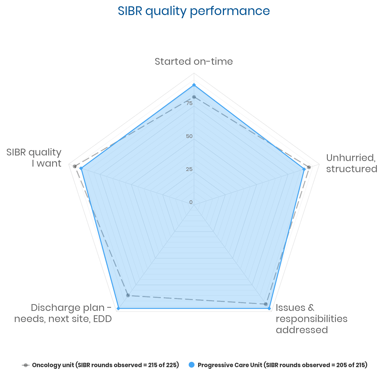 While the overall SIBR quality scores for both units are high, this level of performance is only achieved because of timely interventions when dips in performance are efficiently addressed.For example, as part of the process monitoring, if it is reported that ‘SIBR did not start on time’ a trigger alert is sent to the SIBR supporting team who can then notify the unit leaders about an issue to address, or to commend the team on continuing to deliver SIBR rounds when faced with challenges.