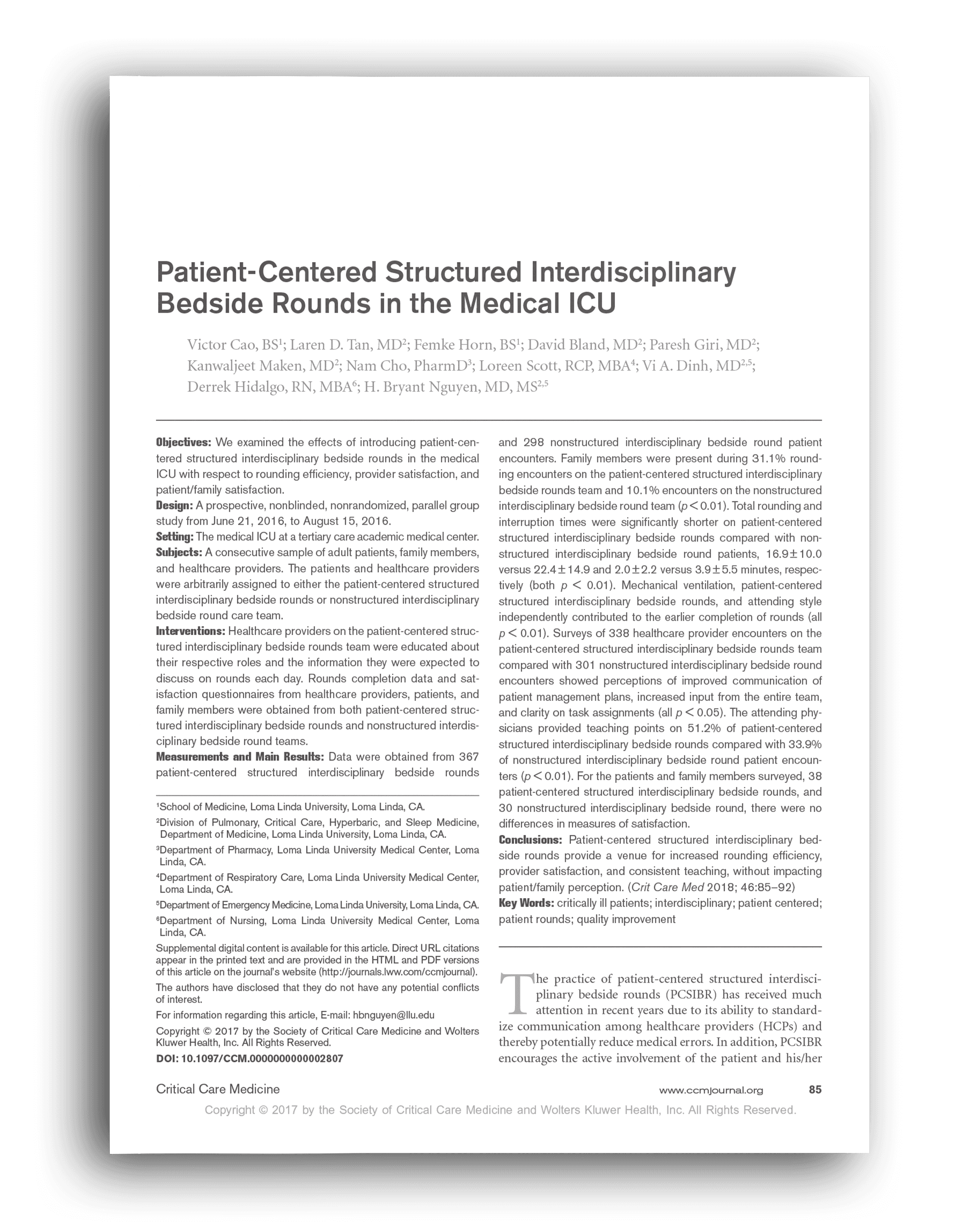 In a study conducted at Loma Linda University Medical Center, the implementation of patient-centered structured interdisciplinary bedside rounds (PCSIBR) in the medical ICU led to increased rounding efficiency, provider satisfaction, and teaching consistency without negatively impacting patient or family perception.