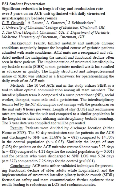 The study was conducted on a 10-bed ACE unit utilizing SIBR as a communication tool among the interdisciplinary team, which included a nurse practitioner (NP), social worker, therapist, nurse-aide, and geriatrician. The geriatrician was present for only 8 hours per week, optimizing cost savings. The study tracked LOS and 30-day readmission rates for three years, comparing the ACE unit’s outcomes with a similar control population not utilizing SIBR.